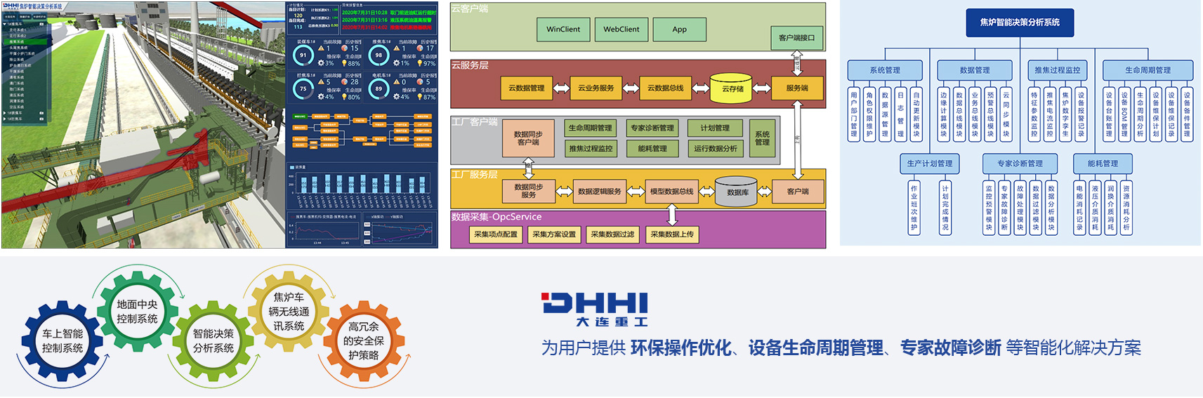 大连重工拥有焦炉机械专业化生产基地,设计、生产、制造的智能化焦炉机械设备已经实现脱离操作或值守人员,按照生产计划在无人操作模式下自动运行,具备危险源识别、智能决策、故障预防、故障报警停机等功能,可向客户提供环保操作优化、设备生命周期管理、专家故障诊断等智能化解决方案。
