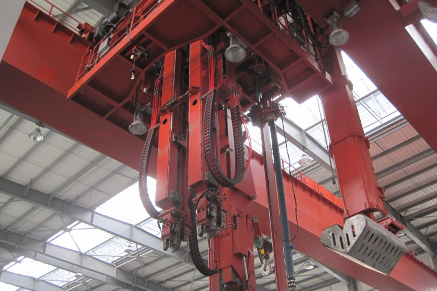钢锭夹钳起重机是将冷钢锭装入均热炉或将加热完成的红热钢锭从炉中取出的起重设备。大连重工研制的钢锭夹钳起重机规格包括:20t、40t、45t、60t、65t。